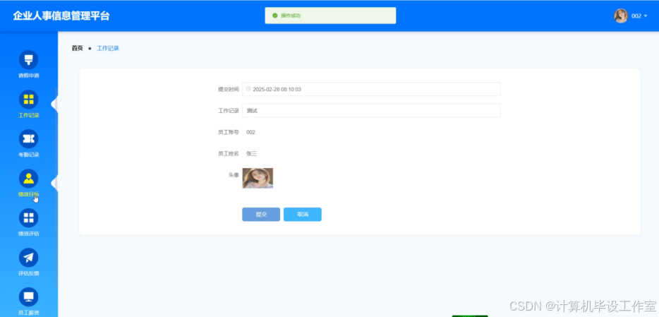 员工可以在工作记录模块,填写工作信息,提交工作记录。管理员则可以在后台查看所有员工的工作记录。