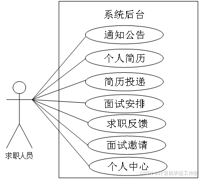 (2)求职人员后台功能需求分析:已注册的求职人员可以登录系统后台,后台首页显示通知公告,可以进行个人简历管理、简历投递记录和状态查看、面试安排、求职反馈、面试邀请和个人中心管理等。