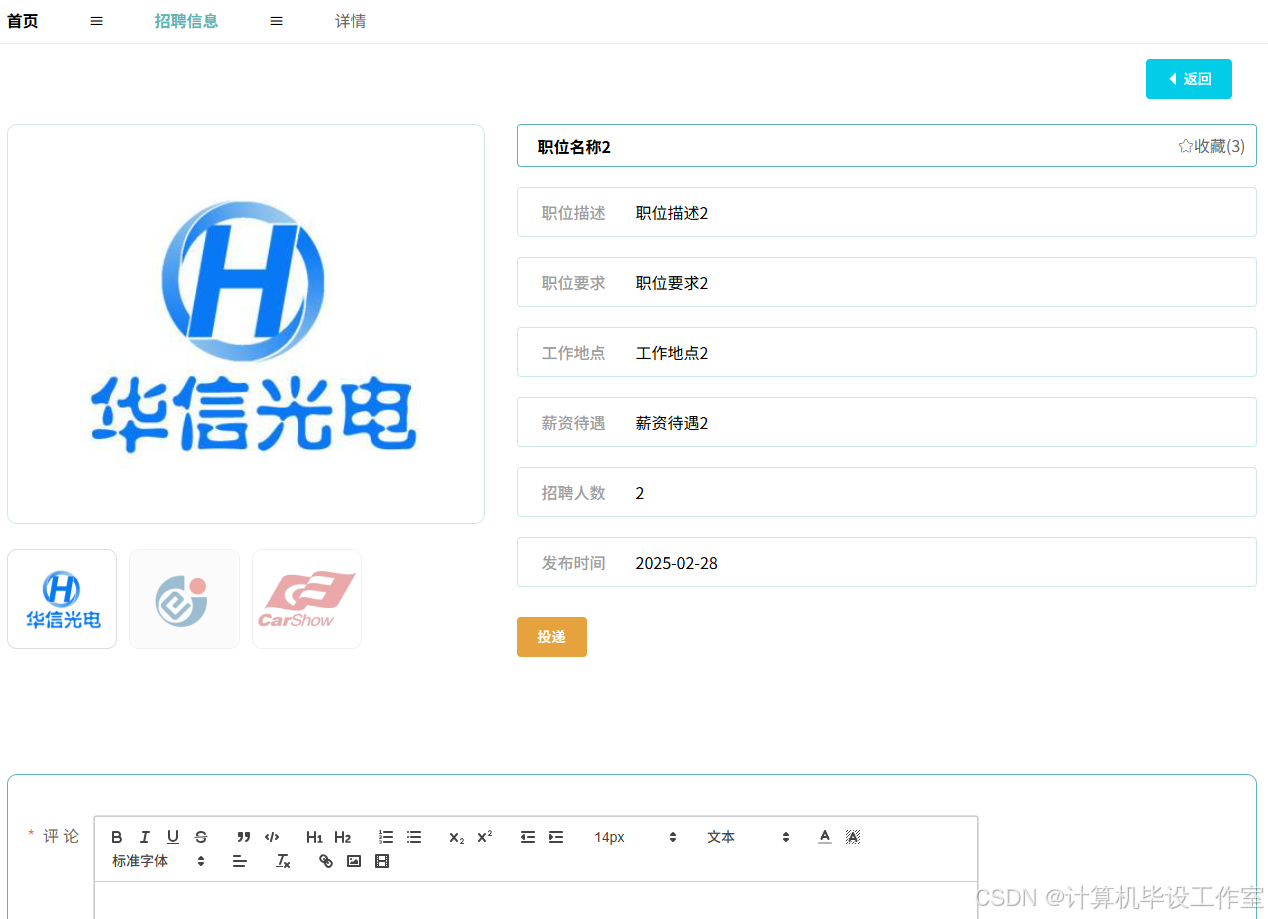 当求职人员点击“招聘信息”后,会进入招聘信息列表,点击任意招聘信息,可以查看招聘岗位详情,求职人员可进行收藏、评论和投递简历等操作。
