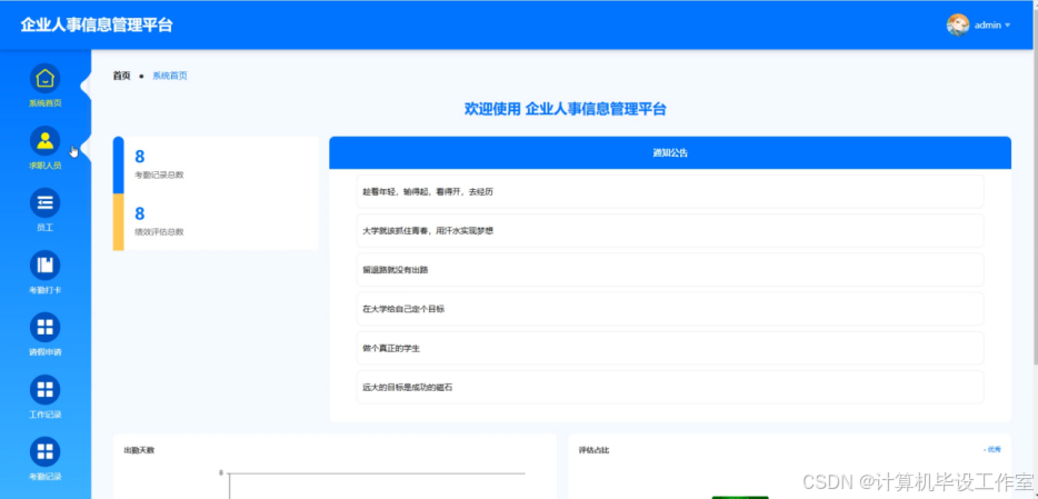 管理员登录系统后台,可对平台进行全面的管理,后台首页提供企业人事信息概览,包含考勤记录总数和绩效评估总数、出勤天数和评估占比图表等在内的数据信息。另外还有通知公告窗口。