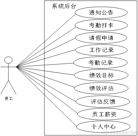 员工功能需求分析:提供注册登录功能,员工注册成功后可登录系统后台,后台首页显示通知公告,可以进行考勤打卡、请假申请、工作记录、考勤记录、绩效目标、绩效评估、评估反馈、员工薪资、个人中心的管理。