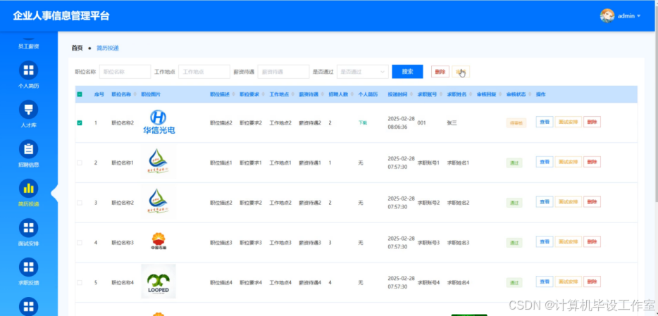 管理员可以简历投递查看求职人员提交的求职信息,并进行审核处理。审核通过的可点击面试安排,填写信息进行提交。求职人员则可以在后台查看自己投递的简历信息和审核状态。