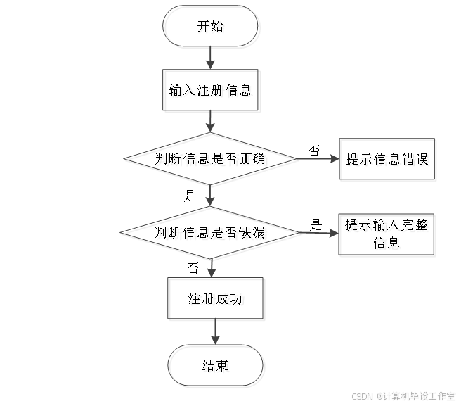 没有账号的用户可进入注册界面进行注册操作,填写注册表格,选择身份后填写账号、密码、昵称、邮箱等必要信息。后台系统验证并保存用户提交的信息。分配唯一用户标识符。注册成功后,用户可以使用账号密码进行登录。用户注册流程图如下图所示。