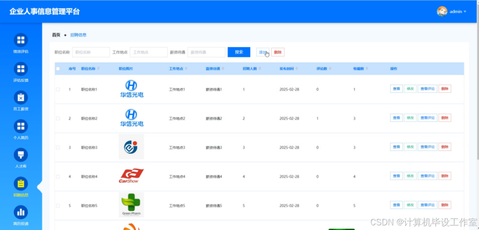 管理员后台的招聘信息管理功能允许管理员发布、编辑和删除招聘信息,详细设定职位名称、工作地点、薪资待遇等关键信息。也可以查看招聘信息的详情和评论。
