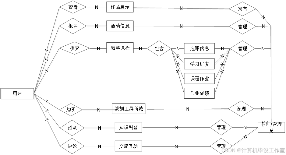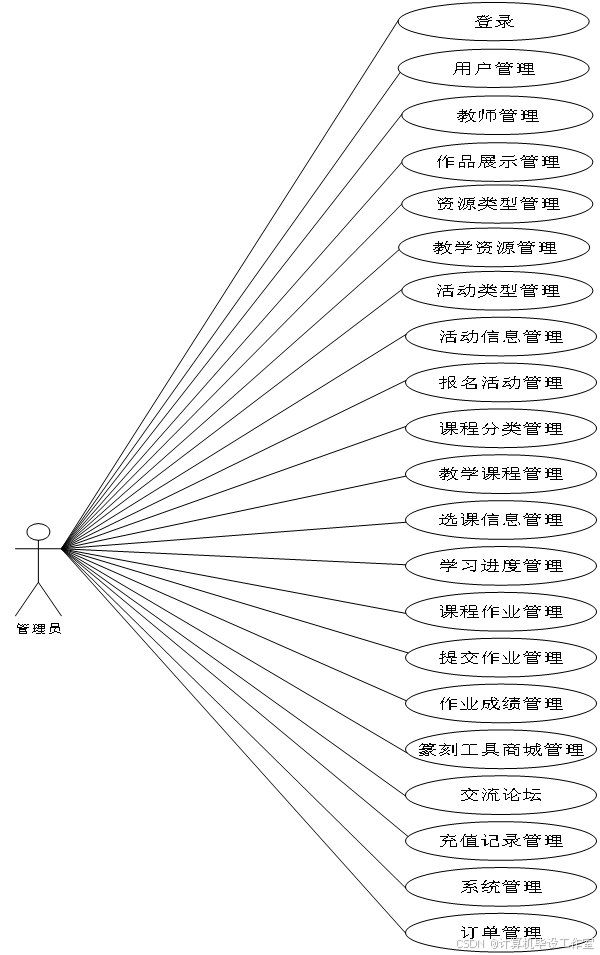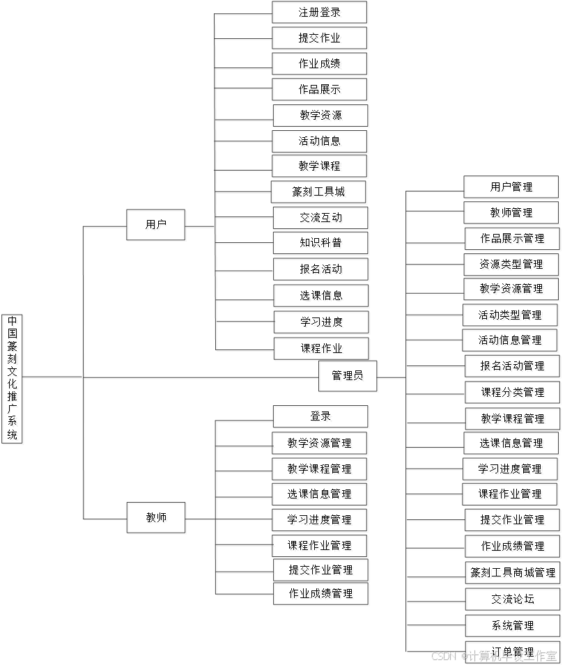 中国篆刻文化推广系统中的管理员功能需求:管理员在中国篆刻文化推广系统中扮演着至关重要的角色,负责多个方面的管理以确保系统的正常运作和用户体验。用户管理包括对普通用户、教师及管理员账户的创建、修改与权限分配;作品展示管理和教学资源管理保证了高质量内容的更新与维护;活动信息管理和报名活动管理则确保各类篆刻相关活动有序开展;教学课程管理、选课信息管理以及学习进度管理帮助跟踪学生的学习路径和效果;课程作业管理、提交作业管理和作业成绩管理促进了教育过程的有效监督;篆刻工具商城管理涵盖了商品上架、库存更新等,支持用户的购买需求;交流论坛为用户提供了一个互动平台,而充值记录管理、订单管理和系统管理确保了财务透明度和系统的稳定运行。