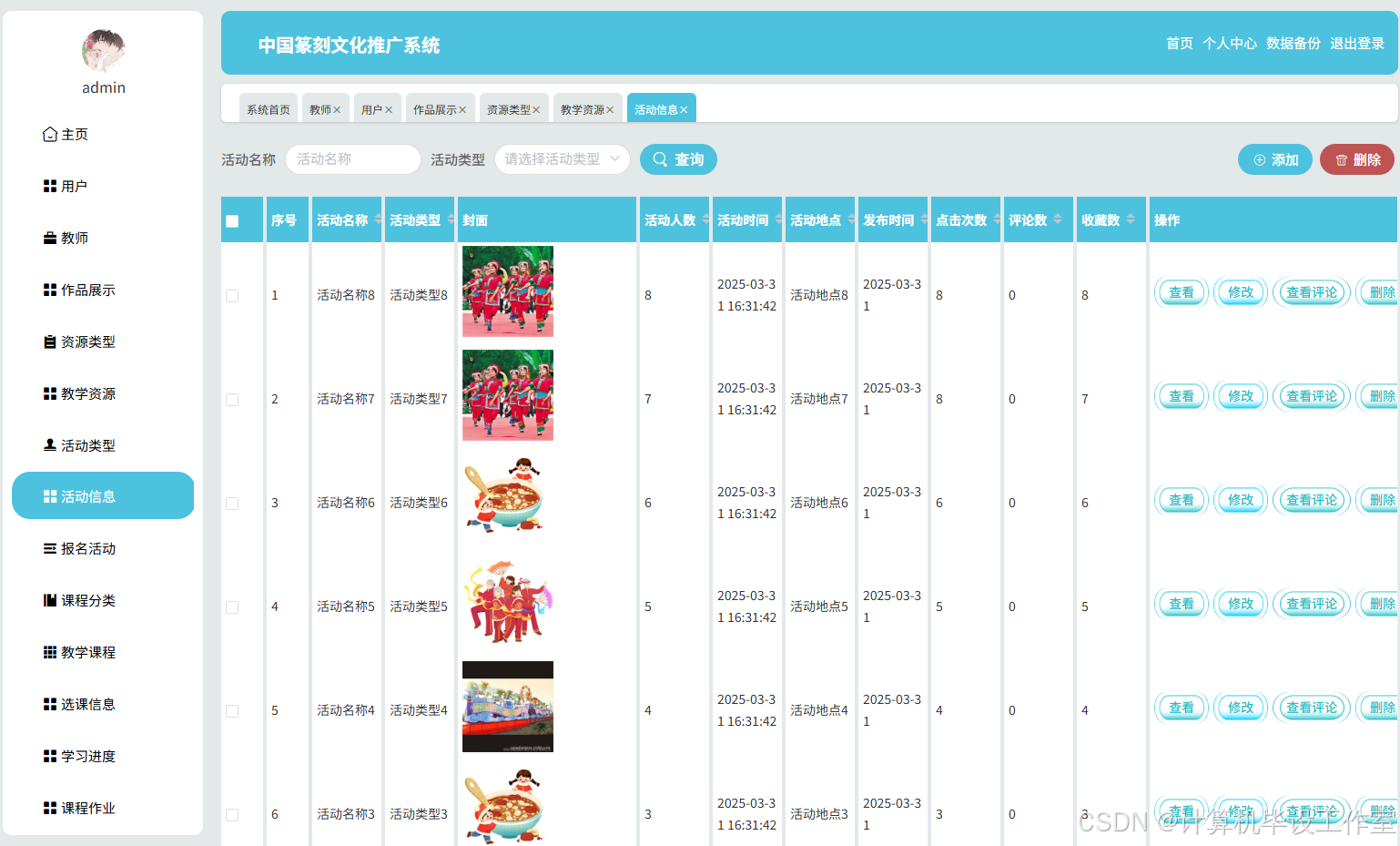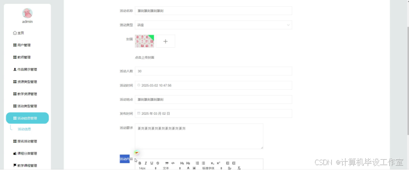 管理员在“活动信息管理”界面中可以对所有系统展示的活动内容进行添加、修改、删除操作,具体的实现界面如下图: