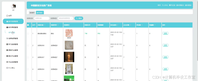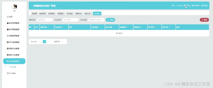 用户可以在教学课程界面中查看教师发布的所有相关篆刻文化的课程内容,可以进行在线选课操作,还可以查看教师布置的课程作业,提交作业以及查看教师公布的作业成绩详情,具体的实现界面如下图5-7所示: