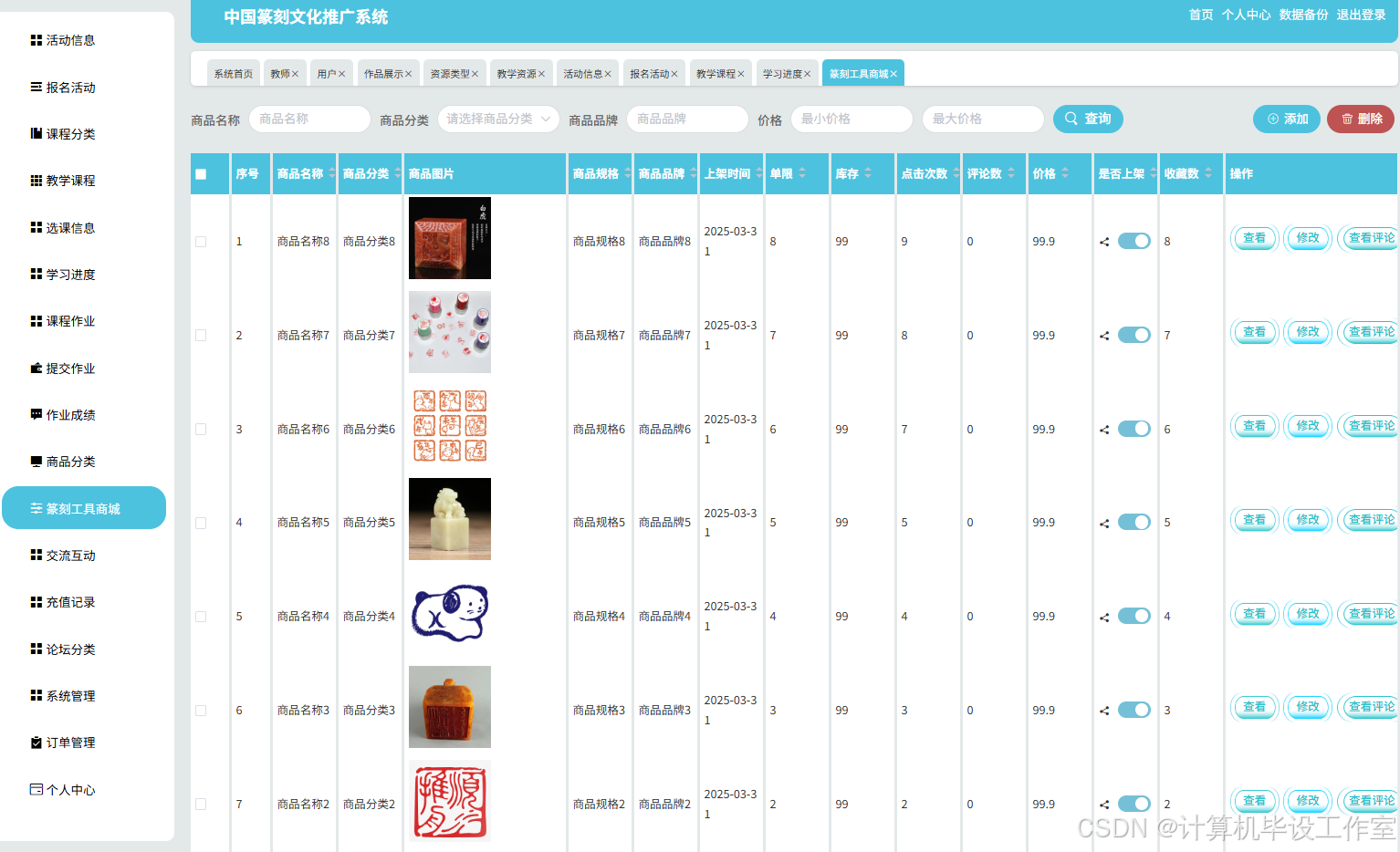 管理员在“篆刻工具商城管理”界面能够对篆刻工具商品进行添加和管理,同时,还可以对订单进行处理。具体的实现界面如下图: