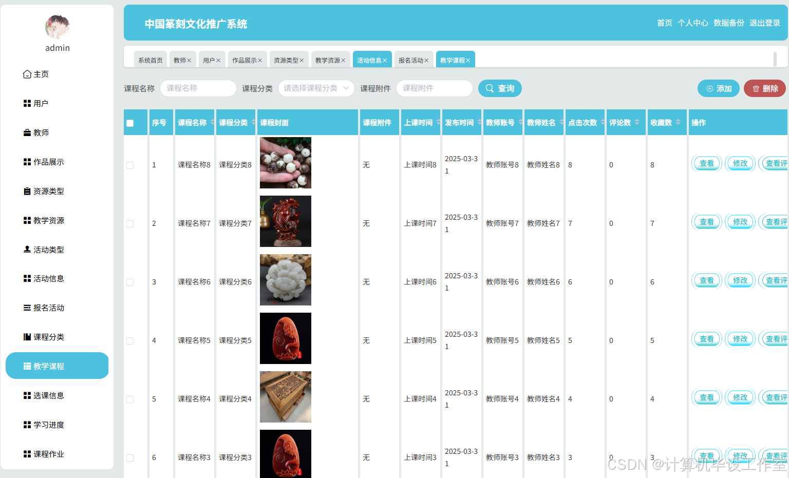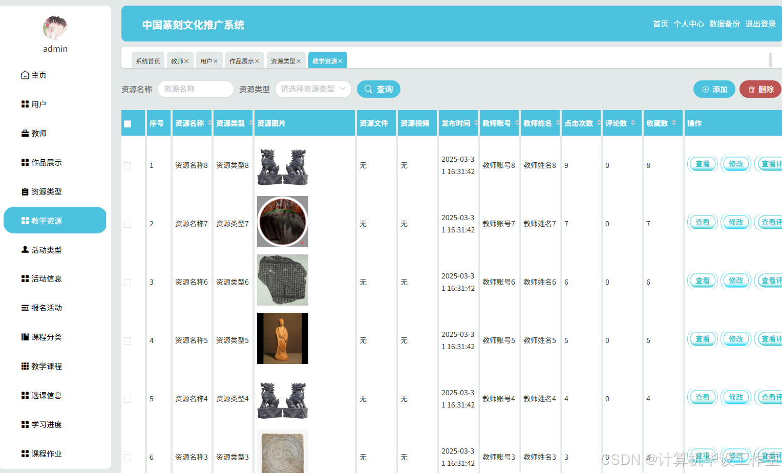中国篆刻文化推广系统中的后台的教师可以在其界面的教学资源管理板块中进行添加课程、修改课程、删除课程等操作,教学资源管理界面如下图5-9所示。