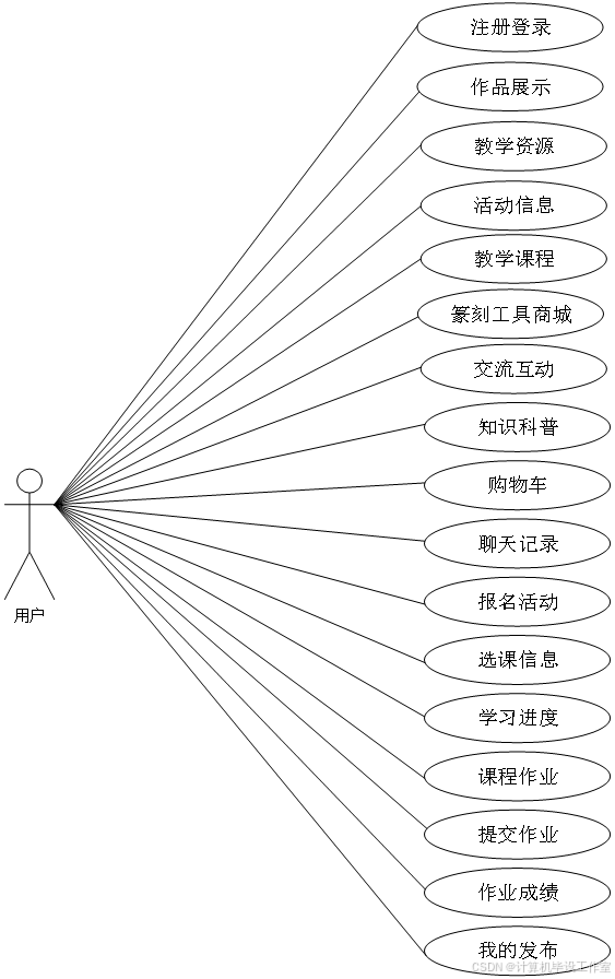 中国篆刻文化推广系统中的用户角色功能需求:注册登录功能允许用户创建个人账户。作品展示为用户提供了一个欣赏和分享篆刻艺术的空间。教学资源部分包含从基础到高级的教程资料。活动信息与报名活动让用户及时了解并参与到各类篆刻活动中去。教学课程模块提供系统的在线学习路径,而选课信息和学习进度管理则支持用户根据自身需求选择课程,并跟踪学习进展。篆刻工具商城满足了用户购买所需工具的需求。交流互动与聊天记录功能鼓励用户之间分享经验、提出问题。知识科普板块普及篆刻文化知识,增加用户的理论素养。购物车功能便于用户收集心仪商品,方便后续购买。最后,课程作业、提交作业及作业成绩管理帮助用户完成课程要求,查看自己的学习成果。