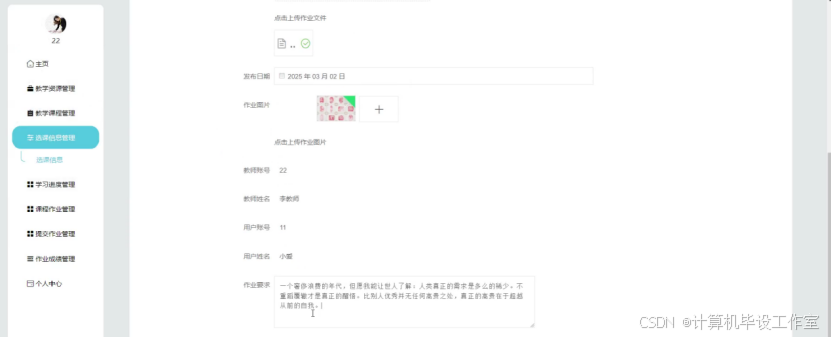 教师在课程作业管理模块,可以对作业信息进行添加、修改、删除操作,具体的实现界面如下图: