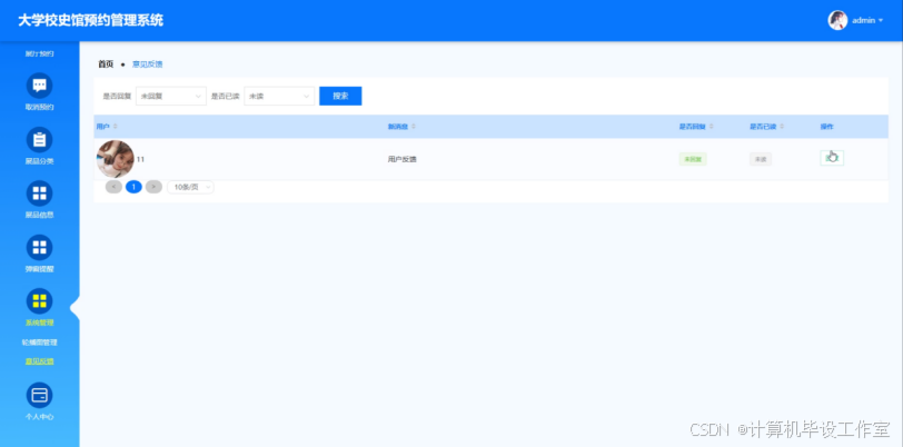 管理员在系统管理模块,可以对轮播图进行查看和修改;进入意见反馈界面,可以查看用户发送的意见反馈,并进行回复。