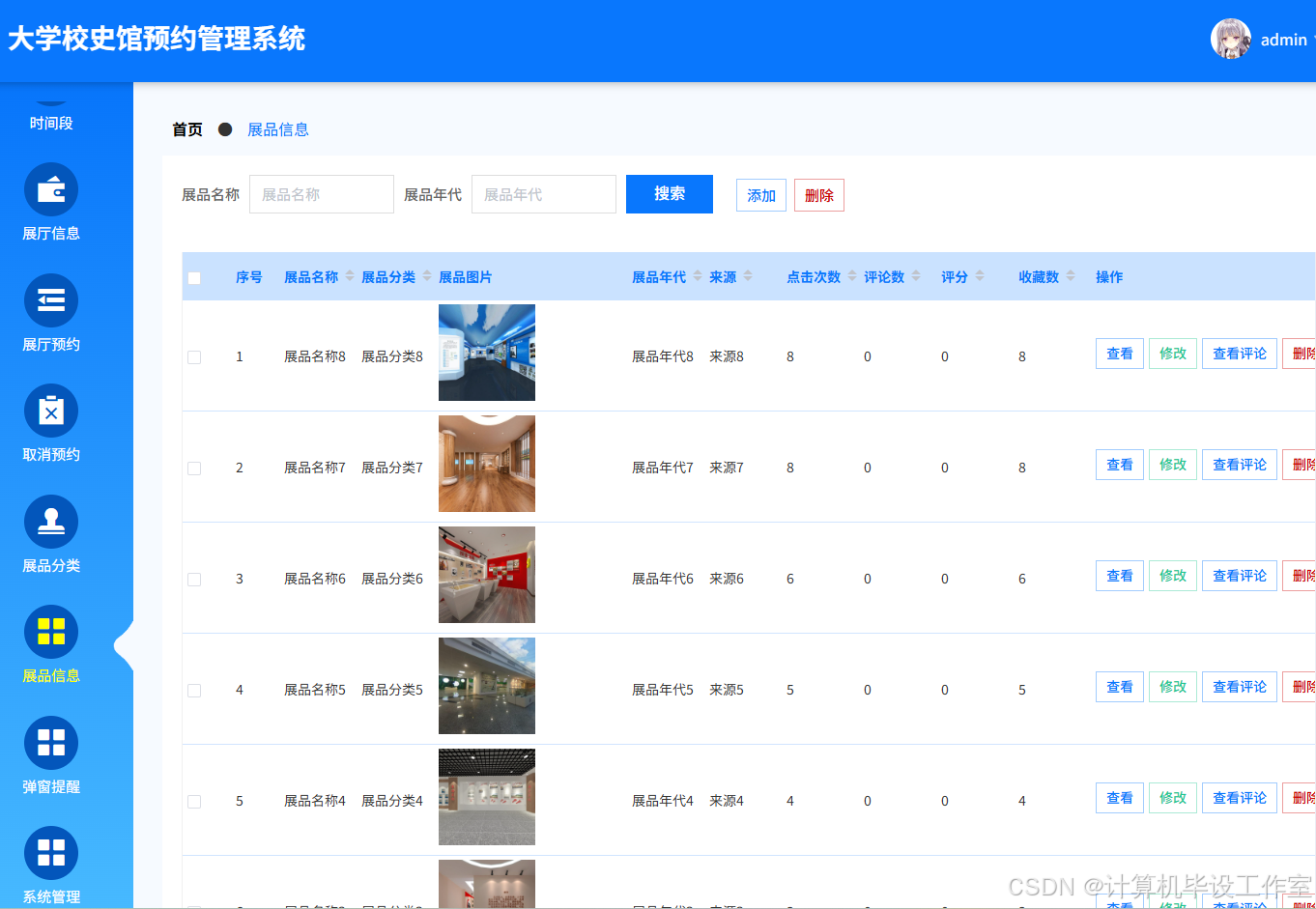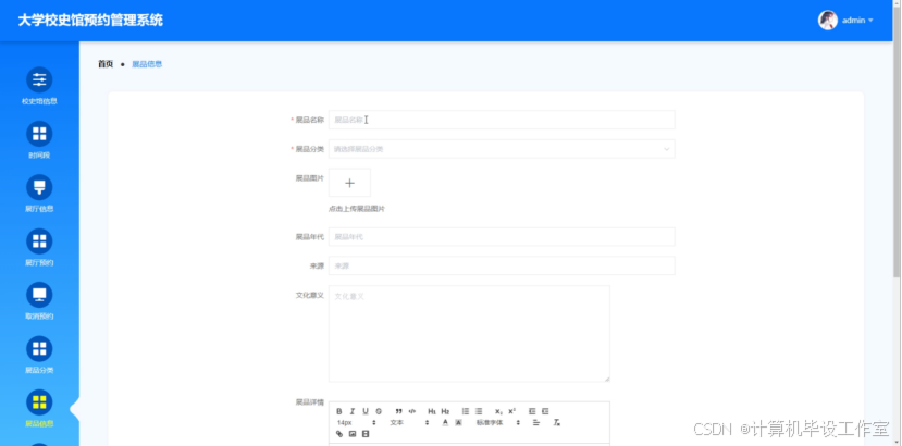 管理员能够通过展品信息模块,可以查看、管理所有的展品信息及其评论,并可对评论内容进行回复、置顶或删除操作,也可根据需求,点击添加按钮,填写相关信息提交,发布新的展品信息。管理员还具有对展品分类增删改除的权限。