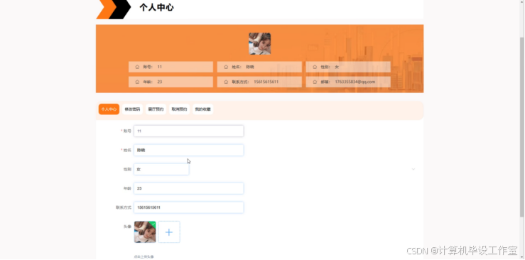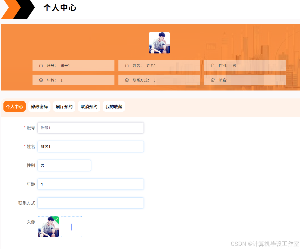 在个人中心模块,用户可查看、修改个人资料和密码;查看自己的提交的展厅预约详情及审核状态,也可修改或取消预约。点击我的收藏可查看自己收藏的内容,可点击跳转至原文,也可进行删除操作。