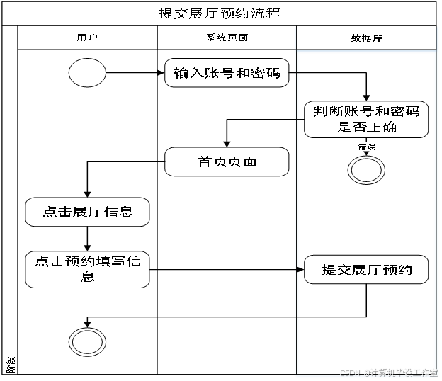 在登录系统后用户可以点击展厅信息进行预约操作,其提交展厅预约流程活动图设计如图4-5所示。