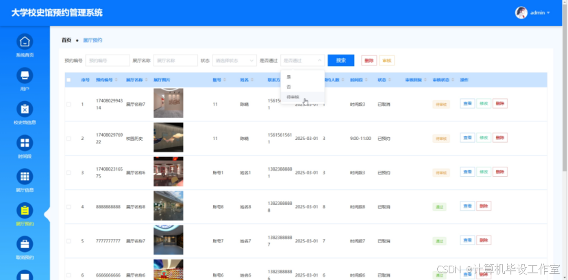 在展厅预约模块,管理员可以查看、管理用户提交的展厅预约和取消预约信息,可按是否通过(如是/否/待审核)进行搜索,对待审核的信息,勾选可一键进行审核。