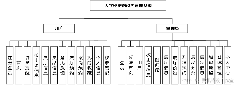 通过对大学校史馆预约管理系统的功能需求分析以及用例分析,得出了该系统的功能模块图,如图4-3所示。