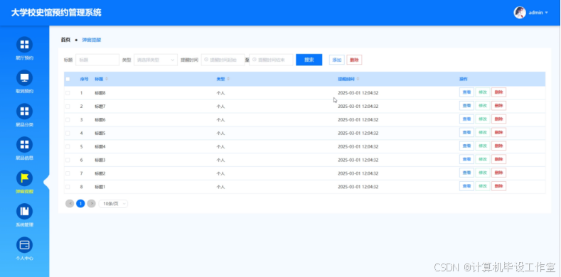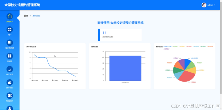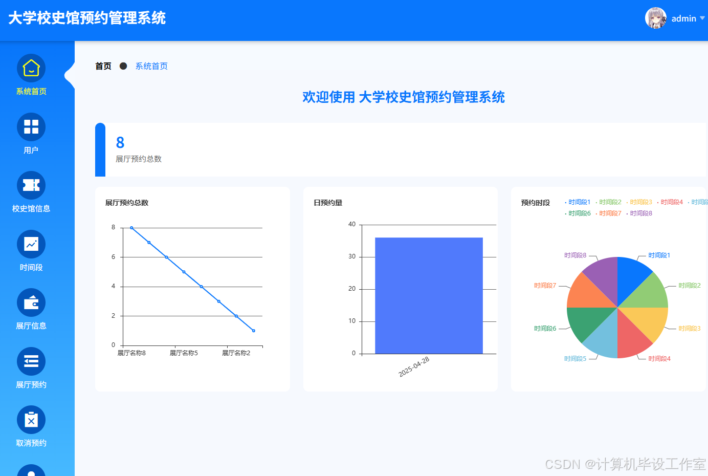 PC后台管理端: 管理员登录后,在后台首页可以查看数据统计图表(如柱状图、折线图、饼图),包括预约总数、每日预约量、预约时间段分布统计图表,展示预约趋势和资源利用情况。有权限对用户信息进行添加、修改以及删除操作;可以对校史馆信息和时间段进行增删改查操作;管理展厅信息,可以查看所有的展厅信息及其评论,并可对评论内容进行回复、置顶或删除操作,也可根据需求,点击添加按钮,填写相关信息提交,发布新的展厅信息;查看、审核用户提交的展厅展厅预约和取消信息;对展品分类进行增删改查操作;可以查看展品信息及其评论,也可删除或添加新的展品;提供弹窗提醒功能,管理员可以填写标题、简介和内容,选择提醒时间,提交提醒内容;在系统管理模块中可以对轮播图进行查看和修改,以及查看用户发送的意见反馈信息,并进行回复;在个人中心可以修改个人信息和密码。