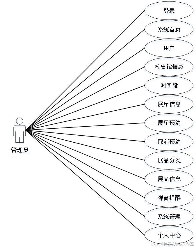 管理员角色的主要功能包括登录、系统首页、用户、校史馆信息、时间段、展厅信息、展厅预约、取消预约、展品分类、展品信息、弹窗提醒、系统管理和个人中心管理等。管理员用例图如图3-2所示。