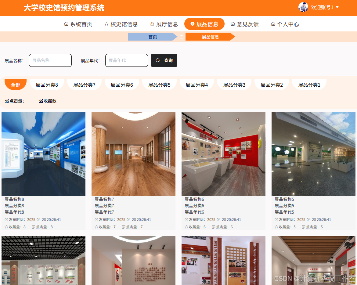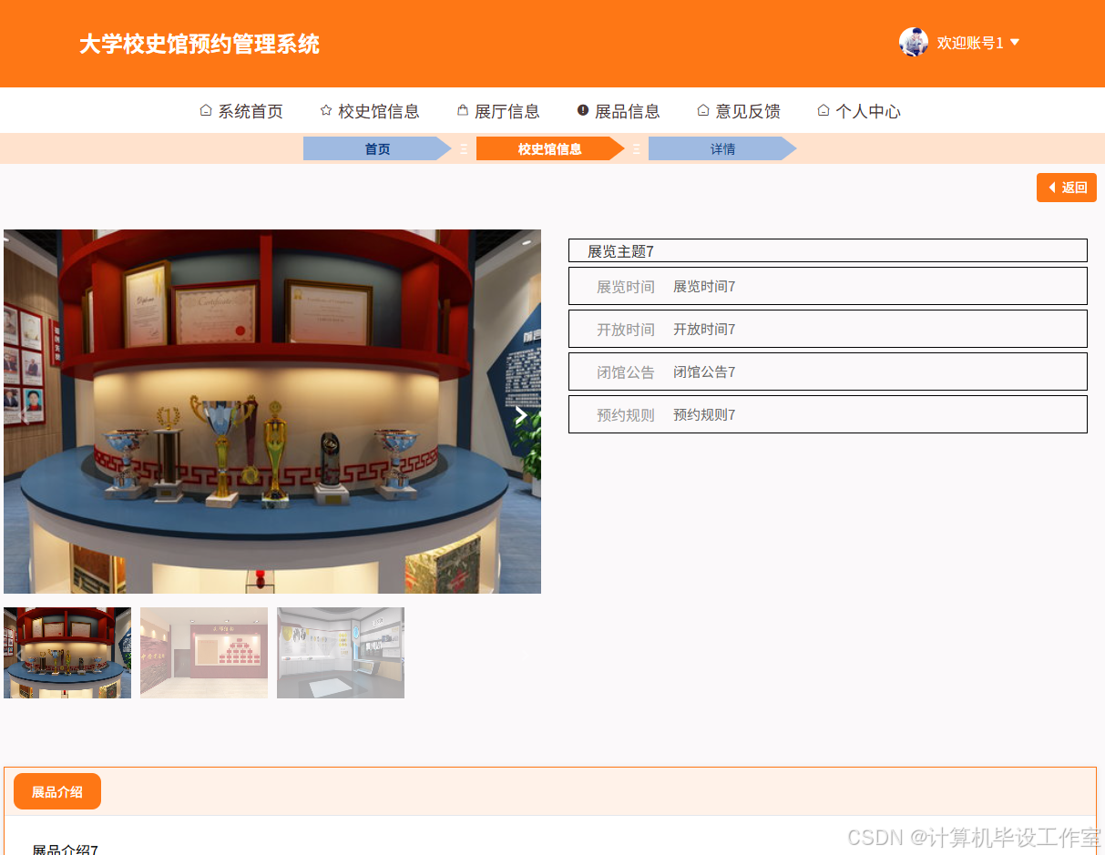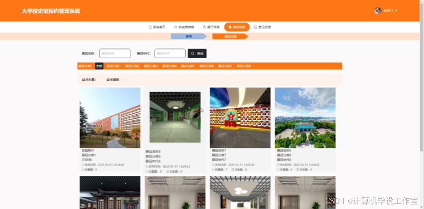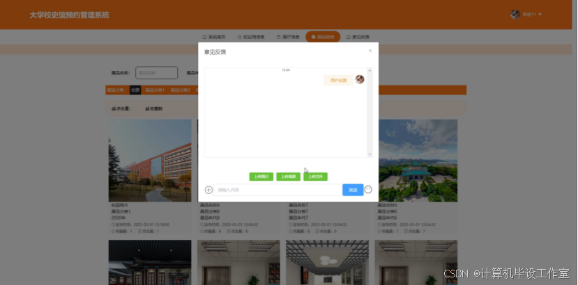 PC前台用户端:游客可以在前台进行注册创建个人账户,注册完成方可登录,提供重置密码功能;提供预约提醒功能,用户在进入系统首页时可以收到预约提示。用户可以查看校史馆信息、展厅信息和展品信息,展厅详情页提供预约入口,用户可直接发起展厅展厅预约,可以对展厅和展品信息进行评论、评分和分享操作,也可收藏展品。意见反馈则允许用户发送信息、上传图片、文件或视频给管理员,以表达自己的意见和建议。在个人中心模块,用户可查看、修改个人资料和密码;查看自己的提交的展厅预约详情及审核状态,也可修改或取消预约。点击我的收藏可查看自己收藏的内容,可点击跳转至原文,也可进行删除操作。