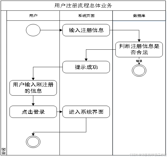 在整体用户注册业务中,当用户进行注册时,管理员会根据用户的情况来执行注册操作。整个用户注册流程的活动图设计如图4-4所示。
