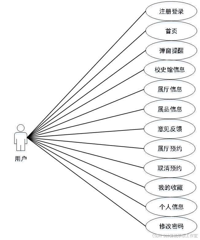 (1)用户主要功能包含注册登录、查看弹窗提醒、校史馆信息、展厅信息和展品信息,提交展厅预约,查看预约状态,可以修改和取消展厅预约,管理自己收藏的内容,修改个人信息和密码,提交意见反馈等。
