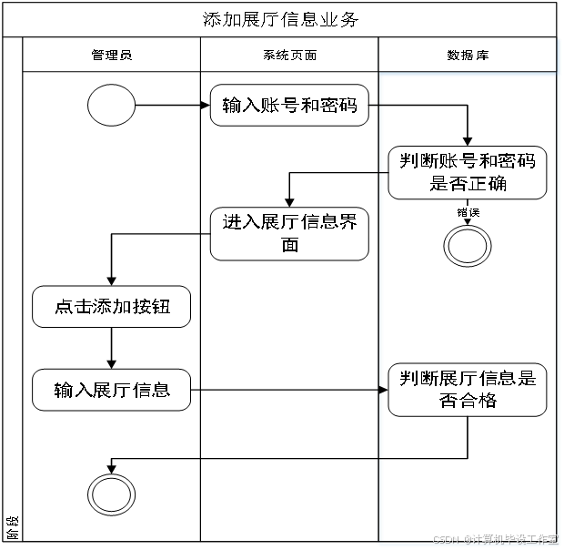 在管理员添加展厅信息的过程中,他们首先登录到网站后台管理界面。然后,点击展厅信息管理模块,并选添加。在这个选项中,管理员可以输入展厅信息,并将其提交到我们的数据库中进行保存。整个添加展厅信息的活动图如图4-6所示。
