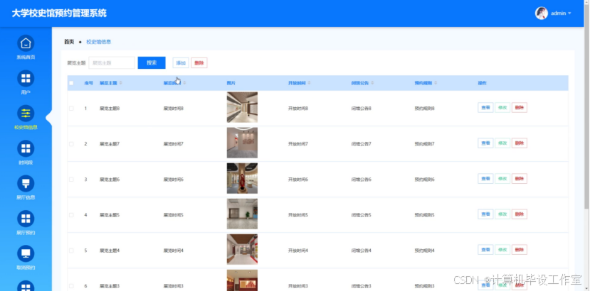 管理员可以通过校史馆信息模块,查看所有的校史馆信息,可以进行修改、删除操作。也可点击添加按钮,填写相关内容添加新的校史馆信息。