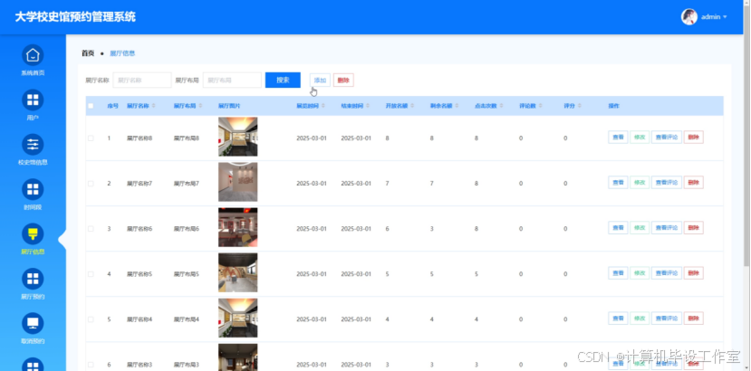 管理员能够通过展厅信息模块,可以查看、管理所有的展厅信息及其评论,并可对评论内容进行回复、置顶或删除操作,也可根据需求,点击添加按钮,填写相关信息提交,发布新的展厅信息。