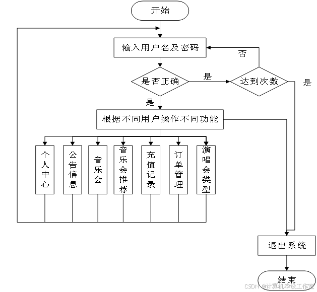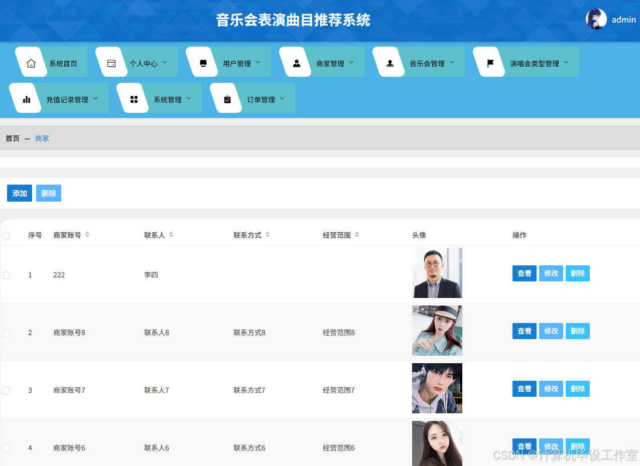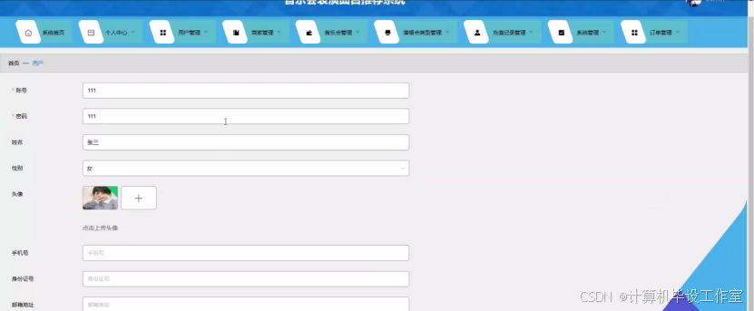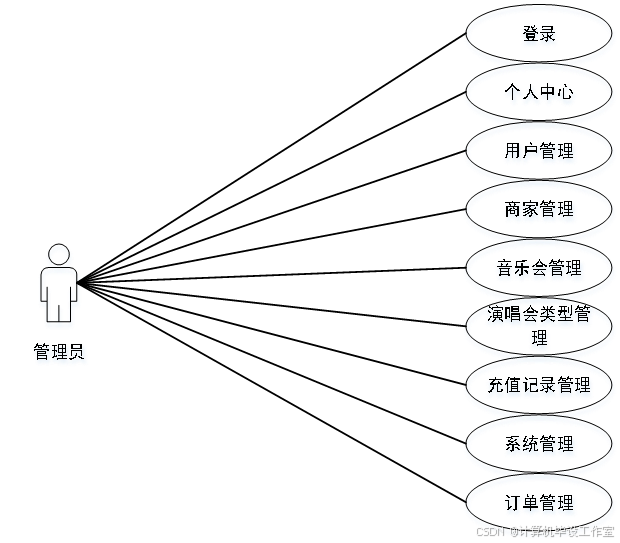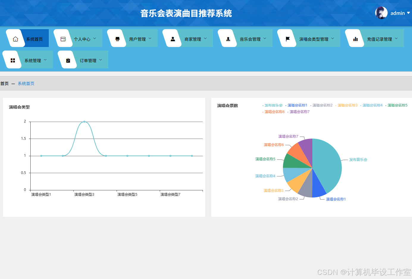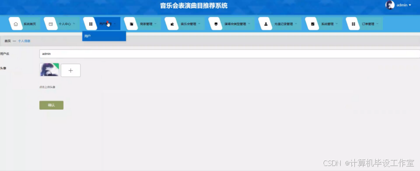 商家先在注册后方可登录使用系统;在首页中可以浏览功能导航栏中的各大功能模块,点击个人中心可以对商家的个人资料进行修改,发布音乐会信息、增删改演唱会类型,处理用户的订单。(3)管理员功能