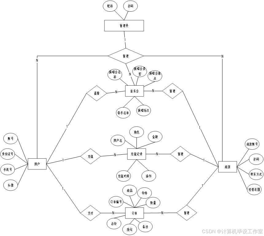 概念设计是数据库设计的第一步,其主要目标是对系统的数据需求进行全面的理解和抽象。在这一阶段,通过建立实体-关系模型(ER模型)来识别系统中的关键实体、属性及其相互关系。概念设计的输出是一个清晰的ER图,作为后续数据库表设计的基础。以下将展示系统的全局E-R图。