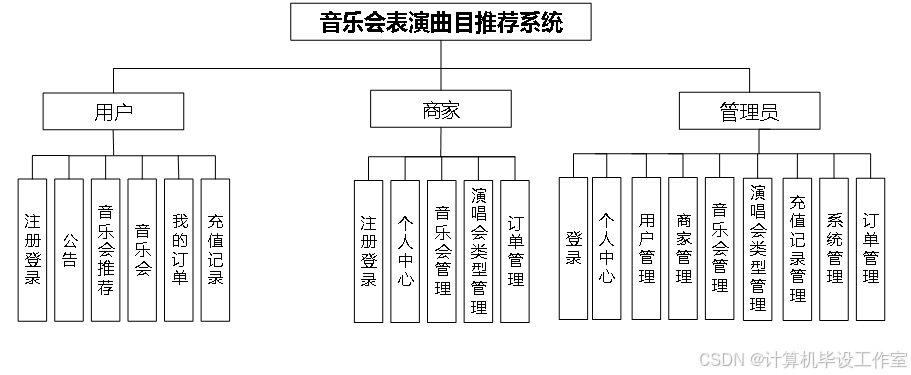此系统的主要功能包括公告信息、音乐会推荐、购买及我的订单管理。公告信息模块用于发布最新的音乐会资讯。音乐会推荐功能则基于用户兴趣和行为数据,结合协同过滤推荐算法,帮助用户发现可能感兴趣的音乐会和表演曲目。购买功能允许用户直接在系统内完成演唱会门票购买,简化了购票步骤,“我的订单”模块让用户可以方便地查看和管理自己的购票记录,包括订单详情、支付状态等。音乐会表演曲目推荐系统致力于构建一个集信息交流、个性化推荐与便捷交易于一体的综合平台,为用户提供无缝连接的音乐体验,同时也为音乐会组织者提供了有效的营销工具。