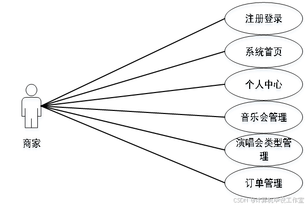 商家先在注册后方可登录使用系统;在首页中可以浏览功能导航栏中的各大功能模块,点击个人中心可以对商家的个人资料进行修改,发布音乐会信息、增删改演唱会类型,处理用户的订单。商家用例图如图3-2所示。