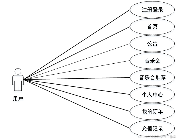 用户先在前台端进行注册创建个人账户,注册完成方可登录;在首页中可以浏览功能导航栏中的各大功能模块,查看公告信息,查看音乐会信息,点击音乐会推荐内容、可以在线进行门票购买,在个人中心中可以修改个人资料和登录密码,查看我的订单以及进行支付操作,还可以在线进行充值。用户用例图如图3-1所示。
