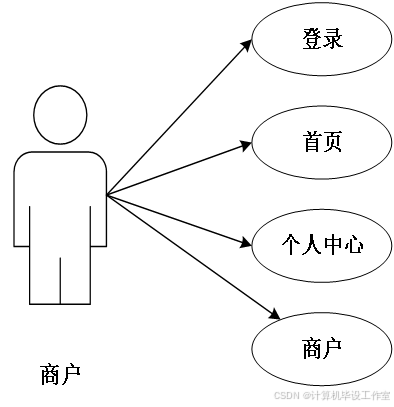 商户登录后,在个人中心可以修改密码和修改个人信息,可以点击商户进行所经营商户资料的上传,包括商铺名称、负责人、图片、联系电话、商户地址、经营范围等,可供前端用户查看。商户用例图如图3-2所示。