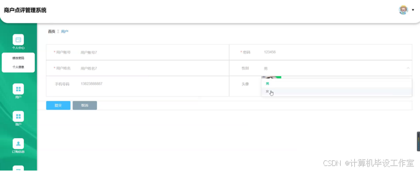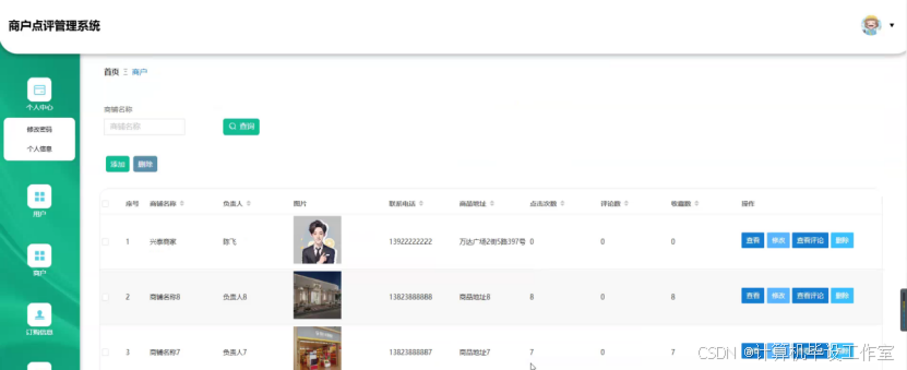商户登录后,在个人中心可以修改密码和修改个人信息,可以点击商户进行所经营商户资料的上传,包括商铺名称、负责人、图片、联系电话、商户地址、经营范围等,可供前端用户查看。(3)管理员功能
