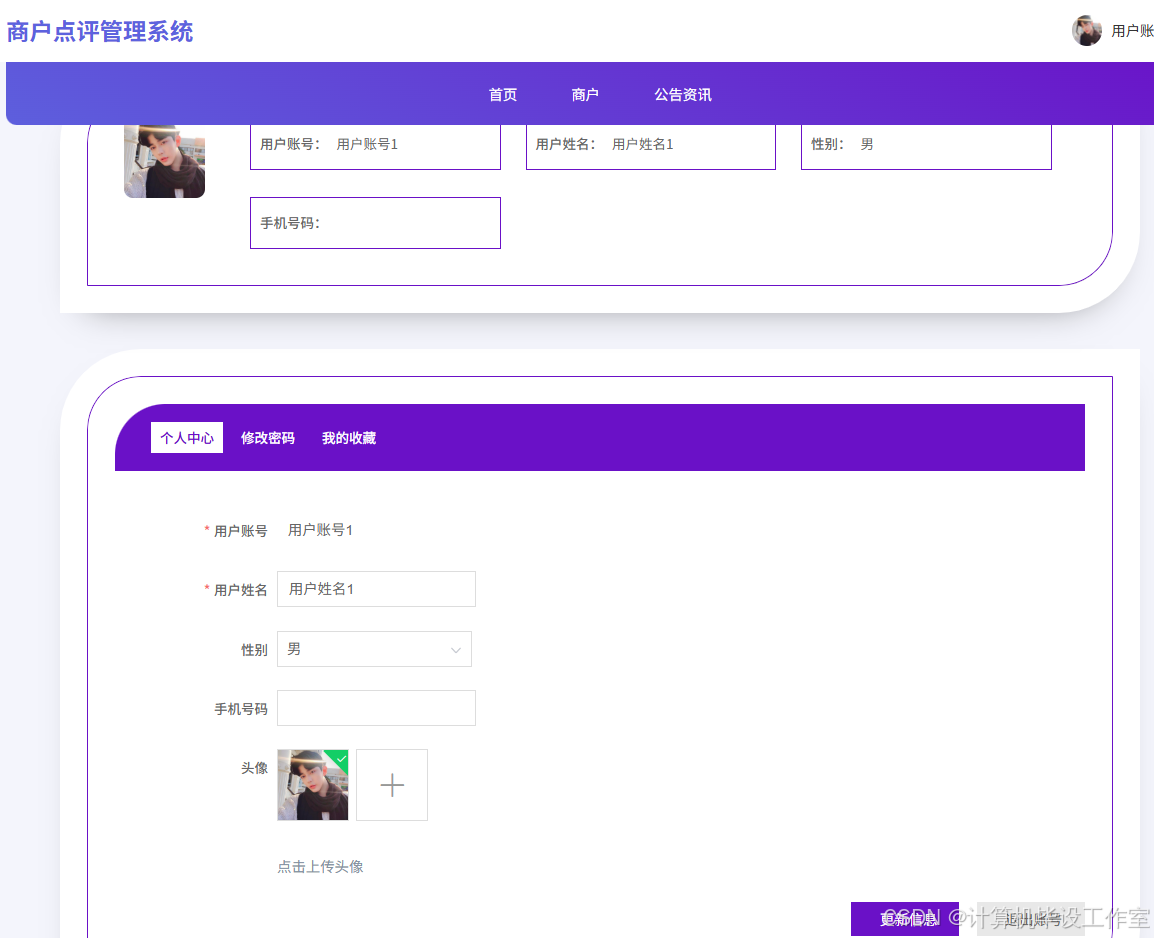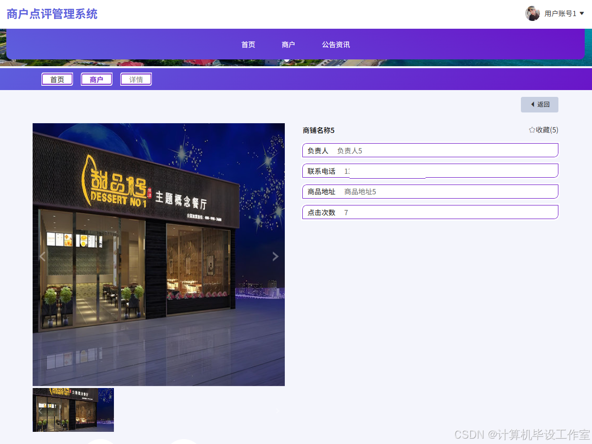 用户可以点击商户推荐界面进行商户信息浏览。用户可以对某个商户进行点赞和收藏或者评论操作,支持在搜索框中搜索某个商户详情。点击查看公告资讯进行最新资讯动态的浏览。可以通过个人中心对个人资料和登录密码进行修改。(2)商户功能