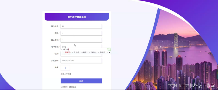 用户可以在商户点评管理系统界面中点击注册按钮,对应输入用户账户、密码、确认密码、用户姓名、性别、手机号码、头像等进行提交,注册后资料由系统验证,验证成功后,表明创建账户成功,用户才可以凭账户和密码进行登录使用该系统。