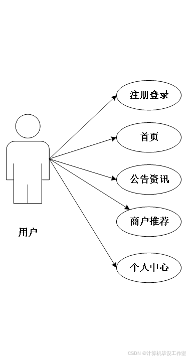 用户可以点击商户推荐界面进行商户信息浏览。用户可以对某个商户进行点赞和收藏或者评论操作,支持在搜索框中搜索某个商户详情。点击查看公告资讯进行最新资讯动态的浏览。可以通过个人中心对个人资料和登录密码进行修改。用户用例图如图3-1所示。