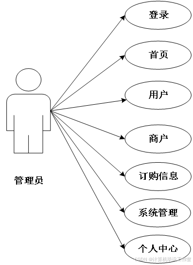 管理员可以对用户进行增删改查操作,并锁定用户账户。管理员可以对商户信息进行管理。管理员负责对每个商户的订购信息进行添加、修改、删除操作。管理员可以对商户统计、点赞数、评论数等进行统计以及通过图表形式进行体现,管理员还系统管理包括关于我们、公告资讯分类、公告资讯、轮播图、系统日志等,主要由管理员进行添加、修改、删除操作。管理员用例图如图3-3所示。