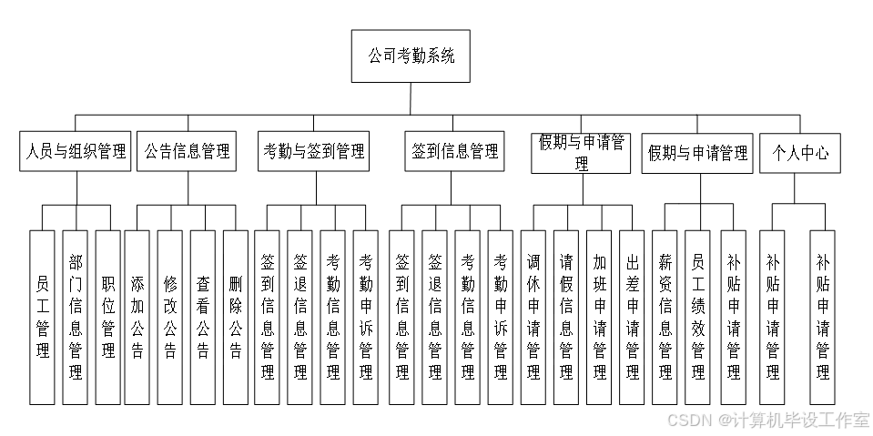 系统涵盖人员与组织、公告信息、考勤与签到等多个模块。各模块下细分多项具体功能,如人员管理含员工、部门信息管理等;考勤管理有签到、考勤申诉等,全面支持公司考勤及相关事务管理