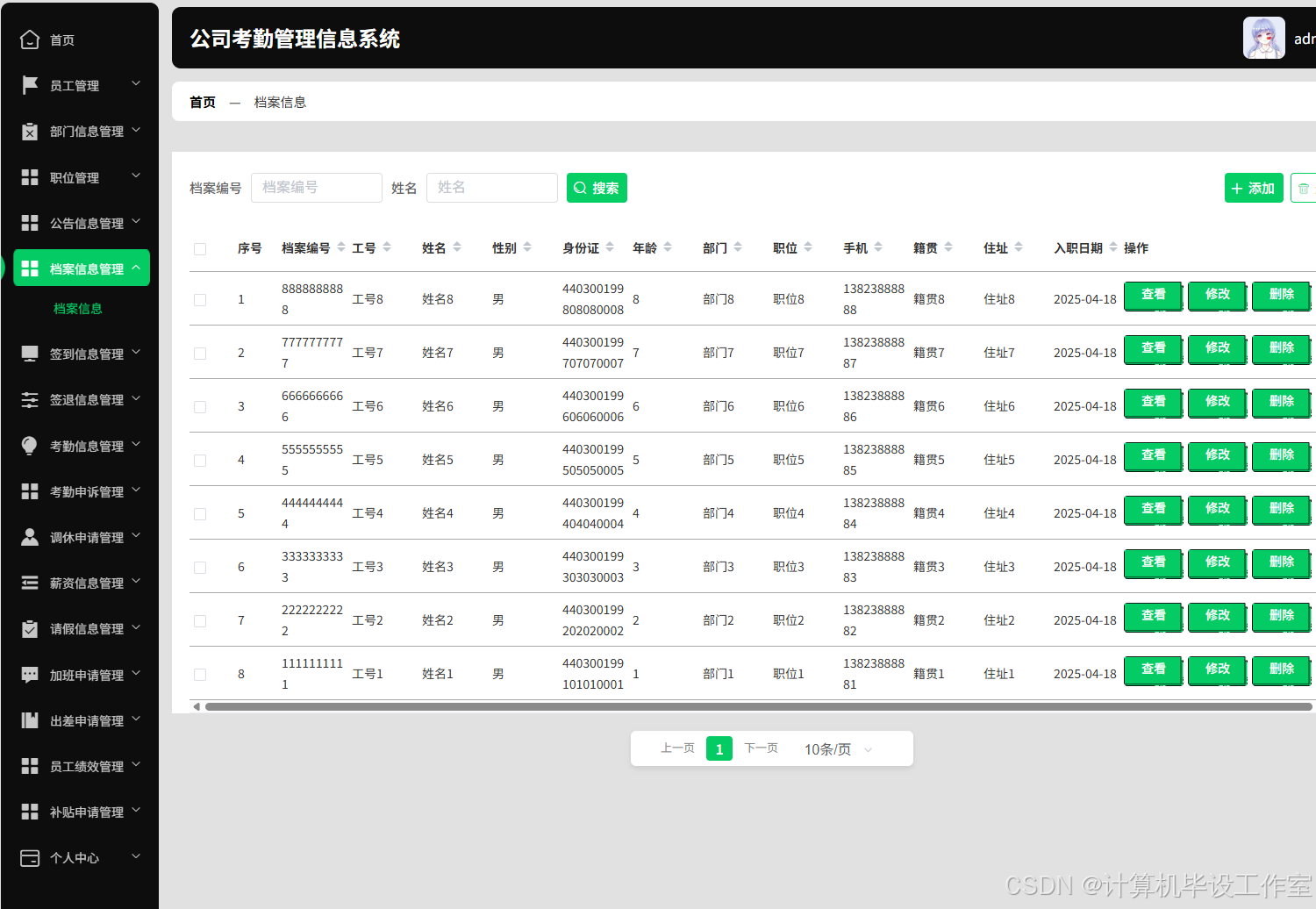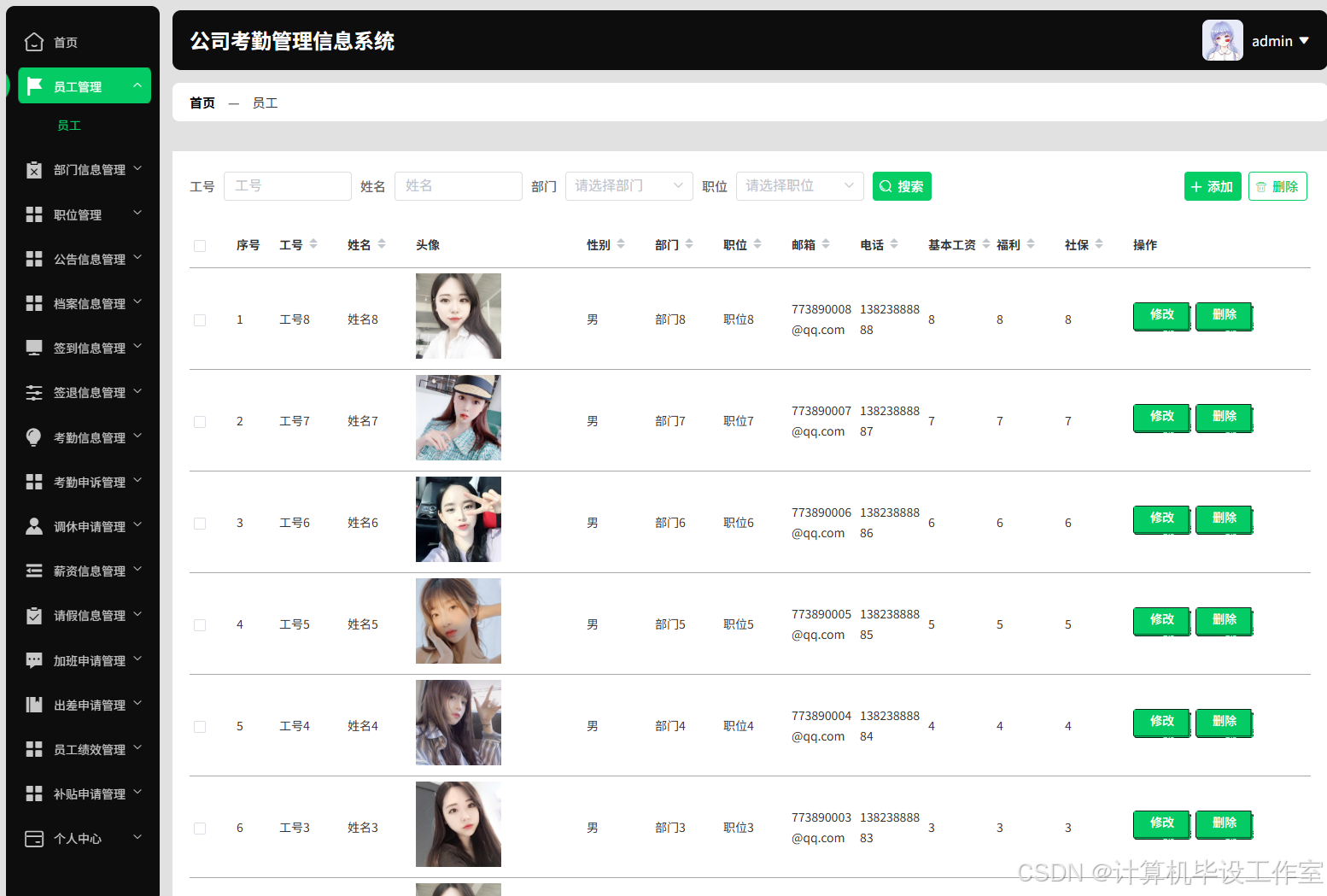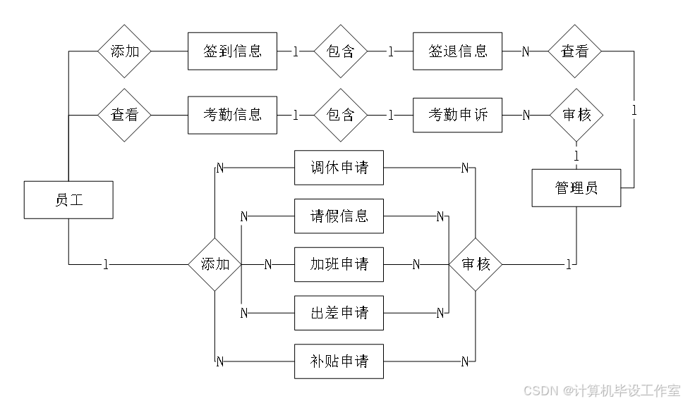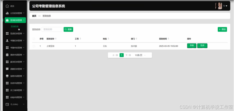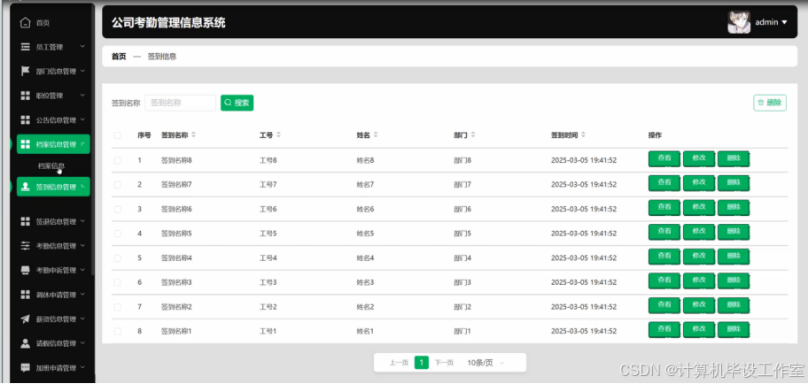 - 签到/签退信息管理:记录员工签到签退时间,生成考勤报表。