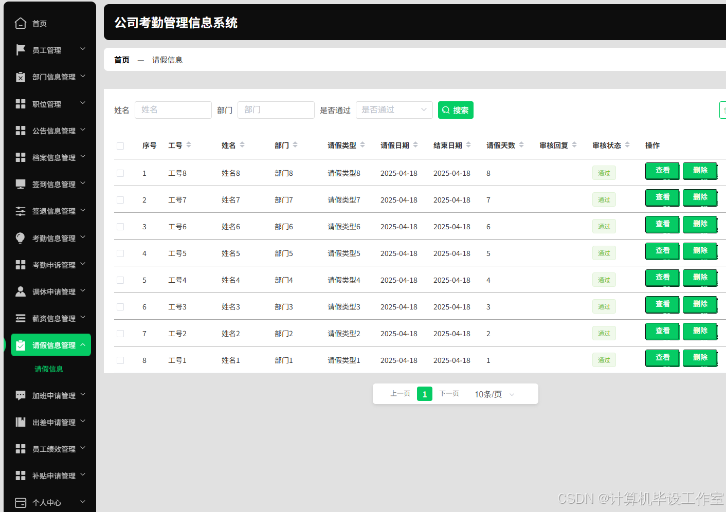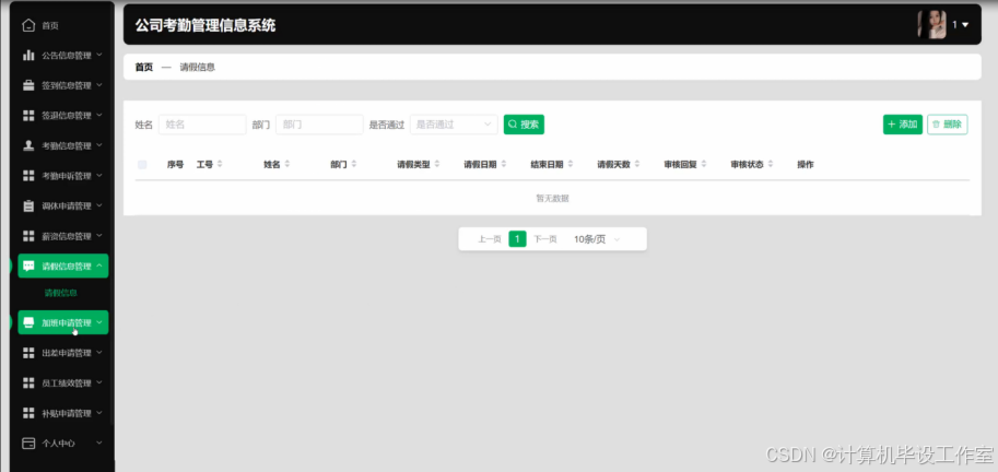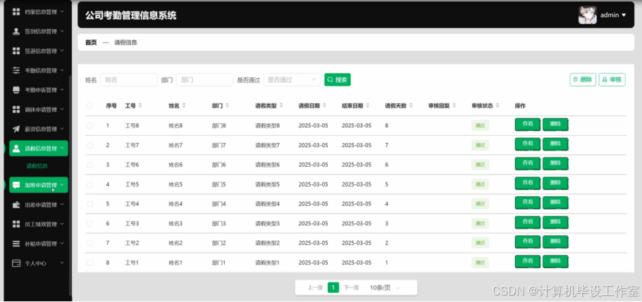 请假信息管理模块界面设计简洁实用,特设搜索框功能,可通过输入姓名、部门以及审核状态选择快速定位相关请假信息。员工拥有增删改查的完整操作权限,方便自主管理请假信息。管理员则具备更高级别的管理权限,不仅可以查看和修改申请,还能对申请进行审核,决定是否批准,同时也可删除不再需要的申请记录,确保请假管理规范有序。如图5.13和5.14所示。