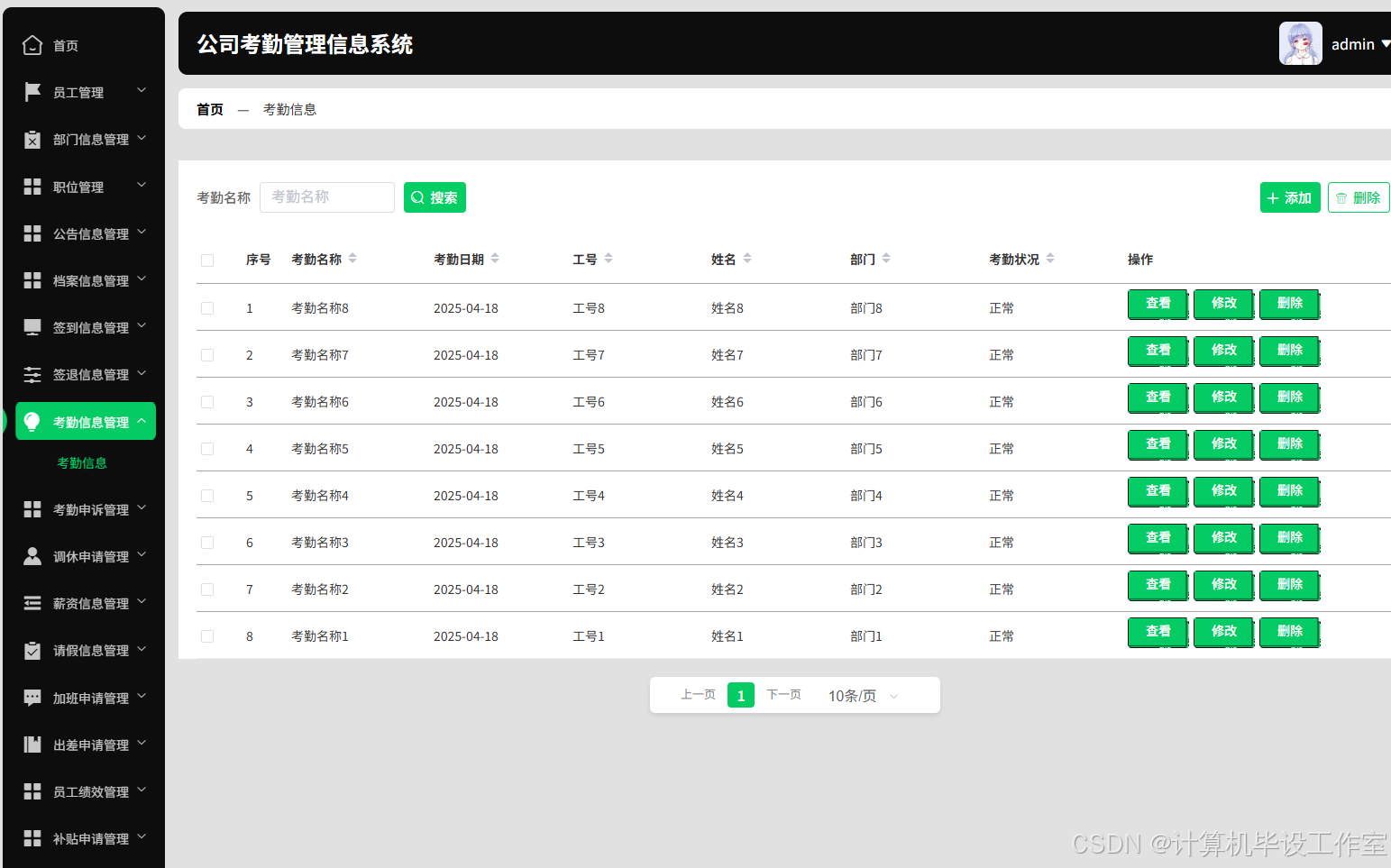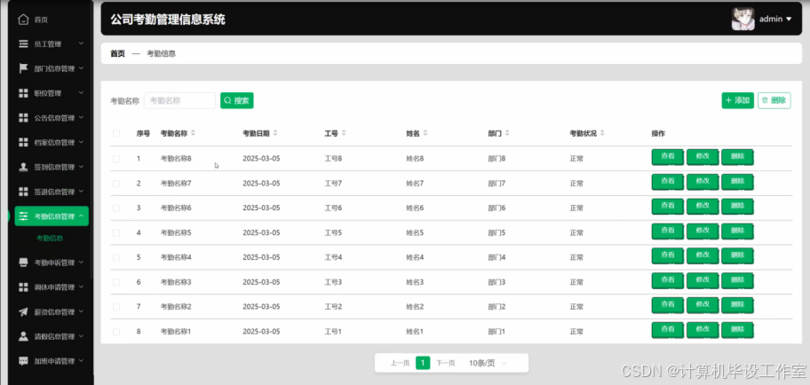 考勤信息管理模块设计界面简洁明了,特设搜索框功能,员工和管理员可通过输入考勤名称快速查询相关信息。考勤信息管理模块功能全面,员工可轻松查看个人考勤记录,并对有异议的记录提出申诉。管理员则拥有更高权限,可对考勤信息进行添加、删除、查看及修改操作,确保考勤数据的准确性和管理的灵活性。如图5.7和5.8所示。