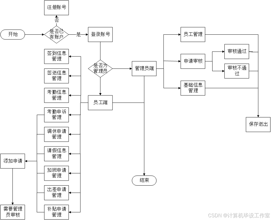 用户从注册或登录账号开始,系统判断用户身份。员工可在员工端进行签到、考勤等多项信息管理和申请操作,部分申请需管理员审核。管理员在管理端进行员工管理、审核申请和基础信息管理等操作。流程最终以保存退出结束,涵盖考勤管理各环节。系统总体业务流程图如图2.1所示。