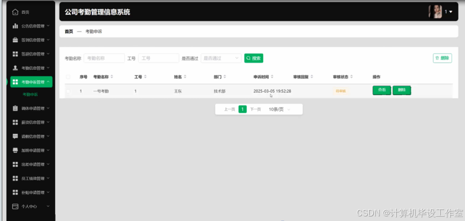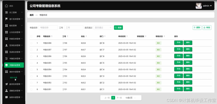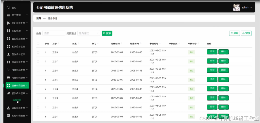 调休申请管理模块界面设计简洁实用,特设搜索框功能,可通过输入姓名以及审核状态选择快速定位相关调休申请。员工拥有增删改查的完整操作权限,方便自主管理调休申请。管理员则具备更高级别的管理权限,不仅可以查看和修改申请,还能对申请进行审核,决定是否批准,同时也可删除不再需要的申请记录,确保调休管理规范有序。如图5.11和5.12所示。