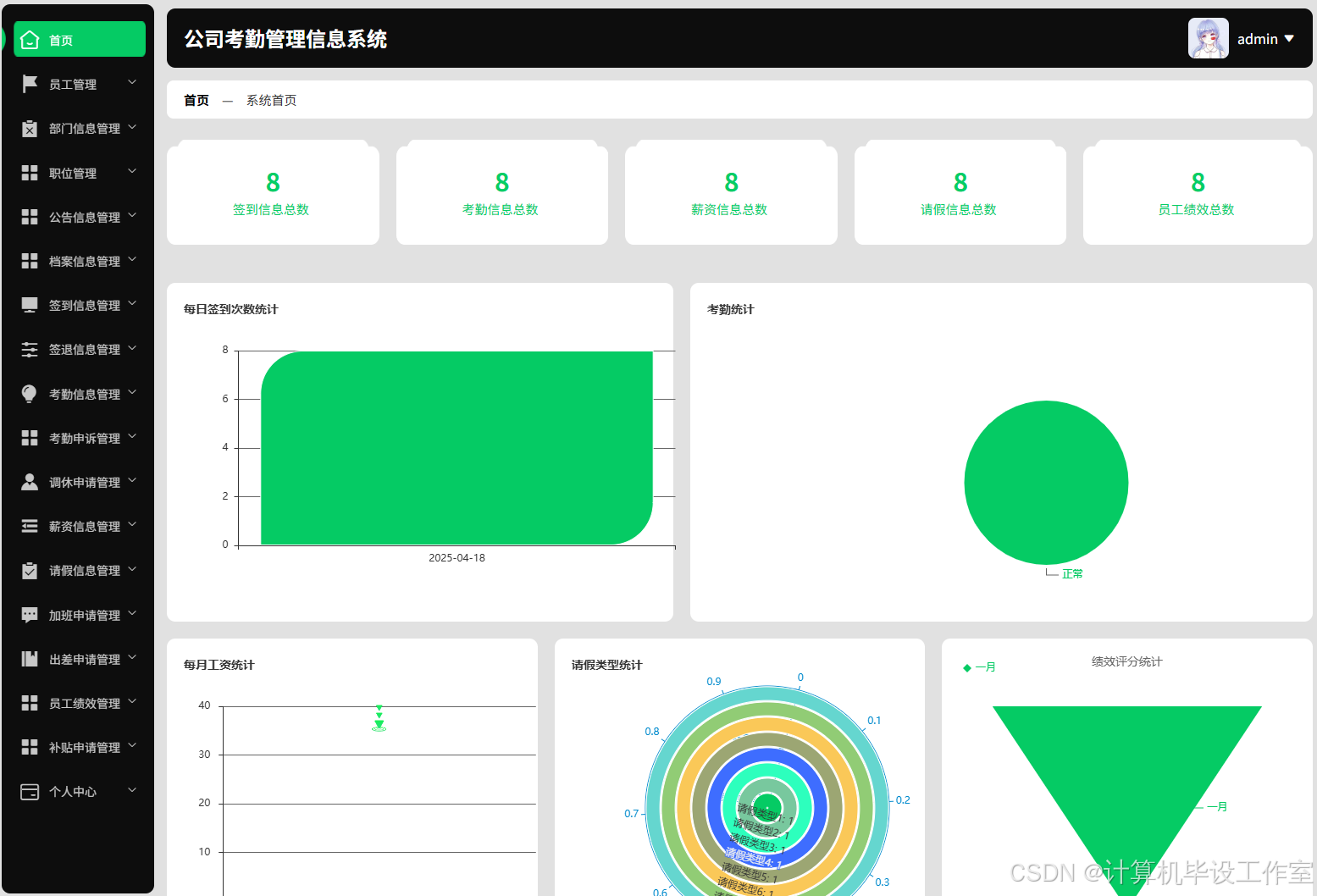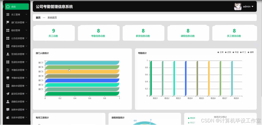- 系统首页:展示考勤概况,如出勤率、迟到早退情况等。