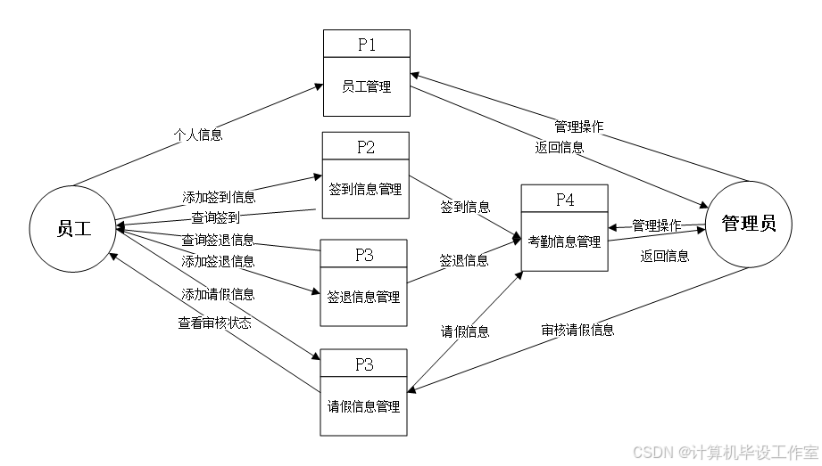 员工可向员工管理模块提供个人信息,与考勤信息管理交互添加、查询考勤及请假信息,并查看审批状态。管理员通过考勤信息管理对各类信息进行管理操作,员工与管理员间存在信息的返回交互,各模块协同支持公司考勤管理工作。中层数据流图如图2.3所示。