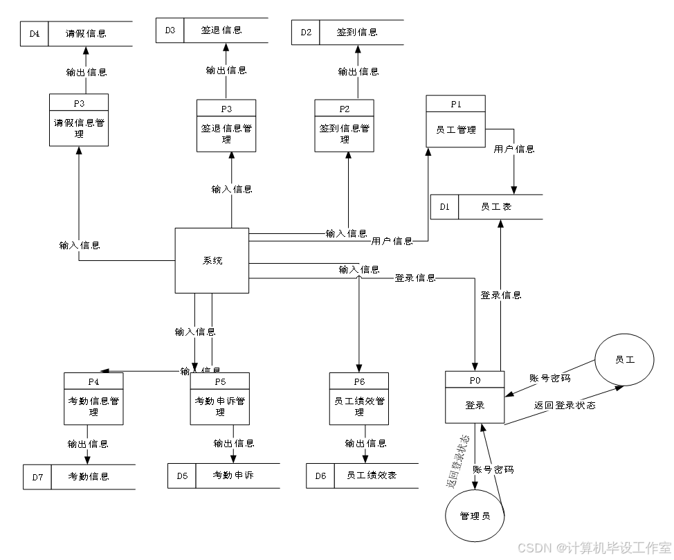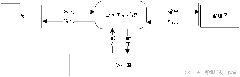 这是公司考勤系统的顶层数据流图。员工向考勤系统输入考勤相关信息,系统处理后向员工输出反馈。管理员也可向系统输入指令,系统输出处理结果。考勤系统与数据库双向交互,对数据进行存储和读取,以实现考勤管理功能。顶层数据流图如图2.2所示。