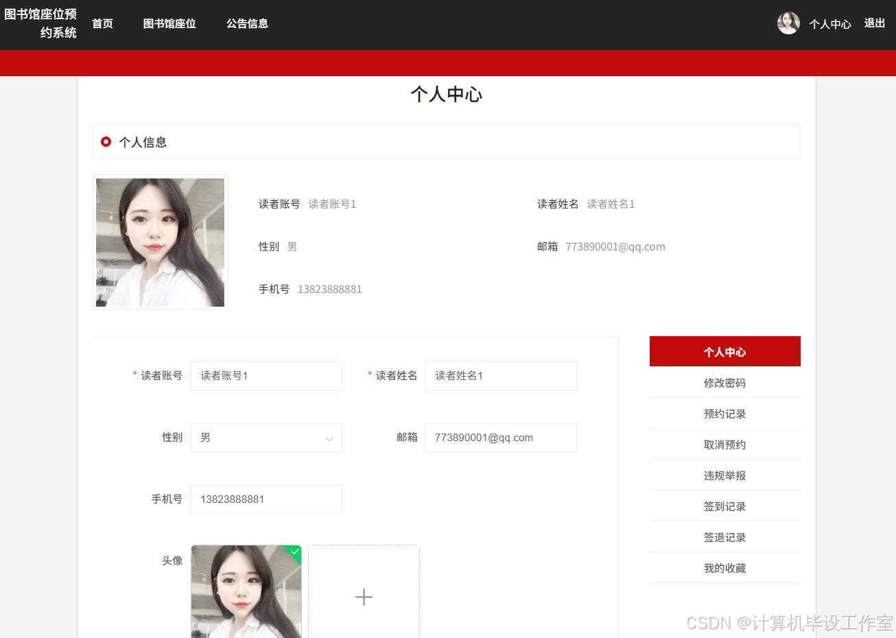 读者进入个人中心模块后,可以对个人信息和密码进行修改更新;在预约记录可以查看自己的预约信息,进行取消预约、违规举报和签到操作;可以在违规举报查看自己提交的举报记录信息,可以进行修改和删除;在签到记录可以查看自己的签到信息,还可进行签退信息的提交;点击我的收藏可查看自己收藏的公告信息和图书馆座位,可点击跳转至原文,也可进行删除操作。